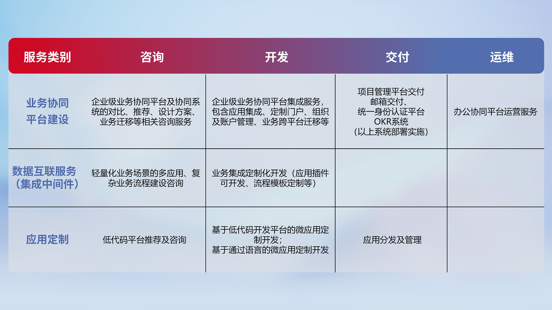 针对钉钉、、企微、、IDaas等平台级产品提供产品的规划、、、方案、、交付、、、定制化开发等服务,,,,实现如统一协同办公、、、智能客户服务、、、混合会议管理、、、智能数据查询、、等业务场景,,实现数字化转型。。